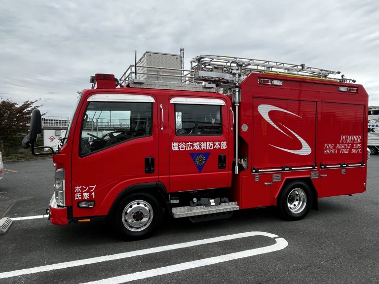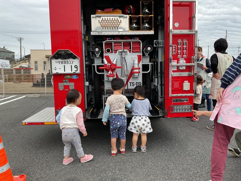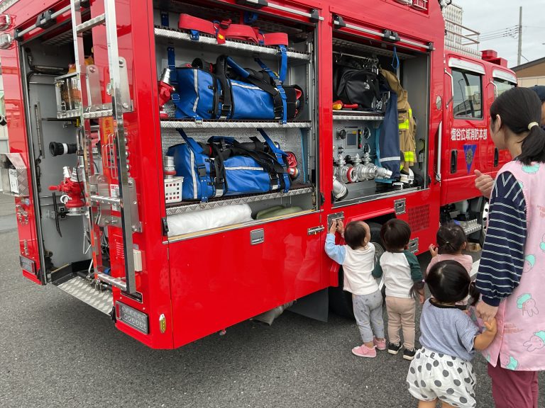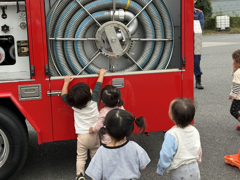 本物の赤い消防車を見た子どもたちは興味津々で、実際に触ったり、タイヤの大きさにビックリするなどしていました。にじ組(2歳児)の子どもたちからは、「これなに?」「この穴はどうするの?」と質問が出ていました。未来の消防士さんの誕生かもしれませんね。