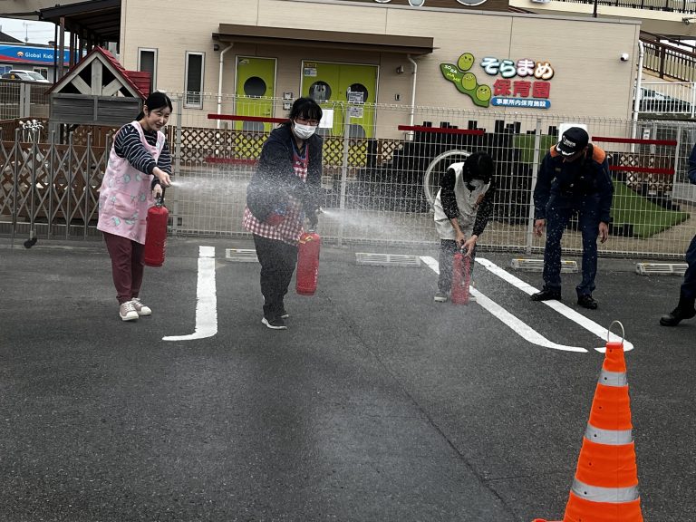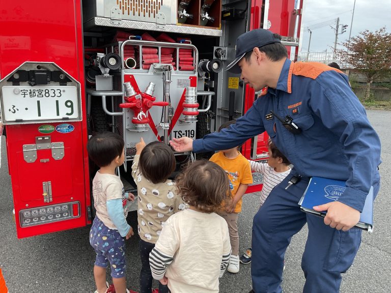 園に消防車が来ると気になる子どもたち。避難消火訓練も毎月行っているので、泣く子もなく落ち着いて先生と避難することが出来ました。逆にドキドキしていたのが先生たちで、通報の先生は側に消防士さんがいたので緊張していたようです。