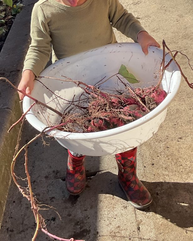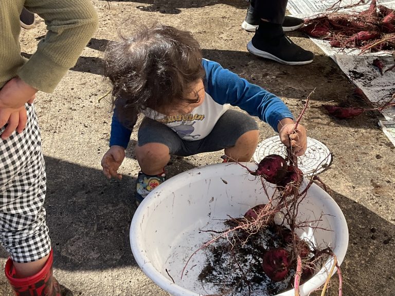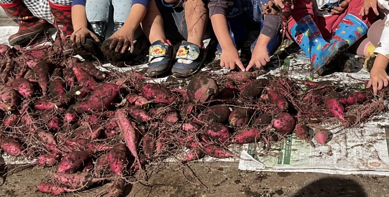 今年も頑張ってくれたのが、にじ組(2歳児)のお友だち。昨年の2歳児のお友だちからしっかり受け継いでいることが、何とも嬉しい先生たち。今年のお芋は、小ぶりでしたが、たくさん収穫出来ました。