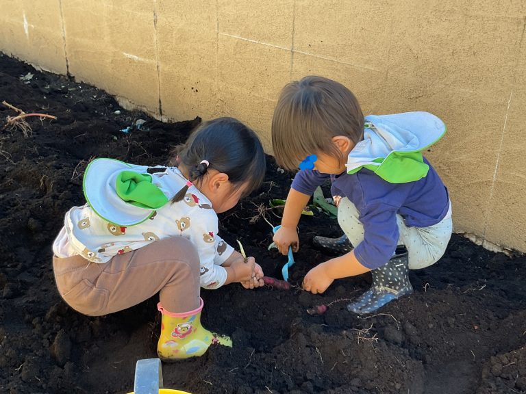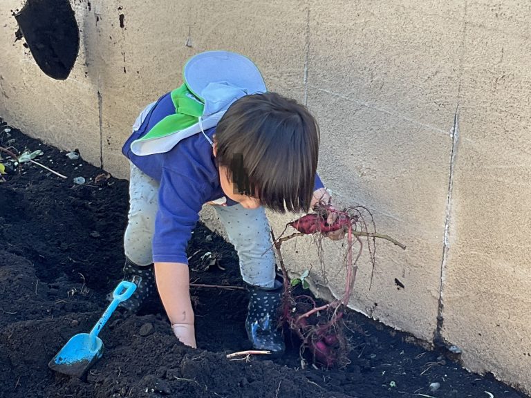 いよいよ今日はおいもほりです。朝からお芋の絵本や手遊びなどで、気持ちが高まり、待ちきれなさそうな子どもたち。外に出るとお芋の弦を引っ張ったり、シャベルや素手で掘ったりと、どうにかお芋を掘り出そうと四苦八苦していました。思い切り引っ張って抜けた時の喜びと、お芋が出てきた時の嬉しさ、そして、大きいお芋なのか?小さいお芋なのか?ドキドキしながら考える楽しさなど、その子によって楽しみ方は様々でした。