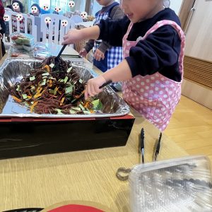 最後は、「福は内」で保育園にたくさんの「福」を呼びました。怖い思いをした後は、パネルシアターで笑い、節分の給食をおいしく、ニコニコで食べていました。ドキドキの1日でした。